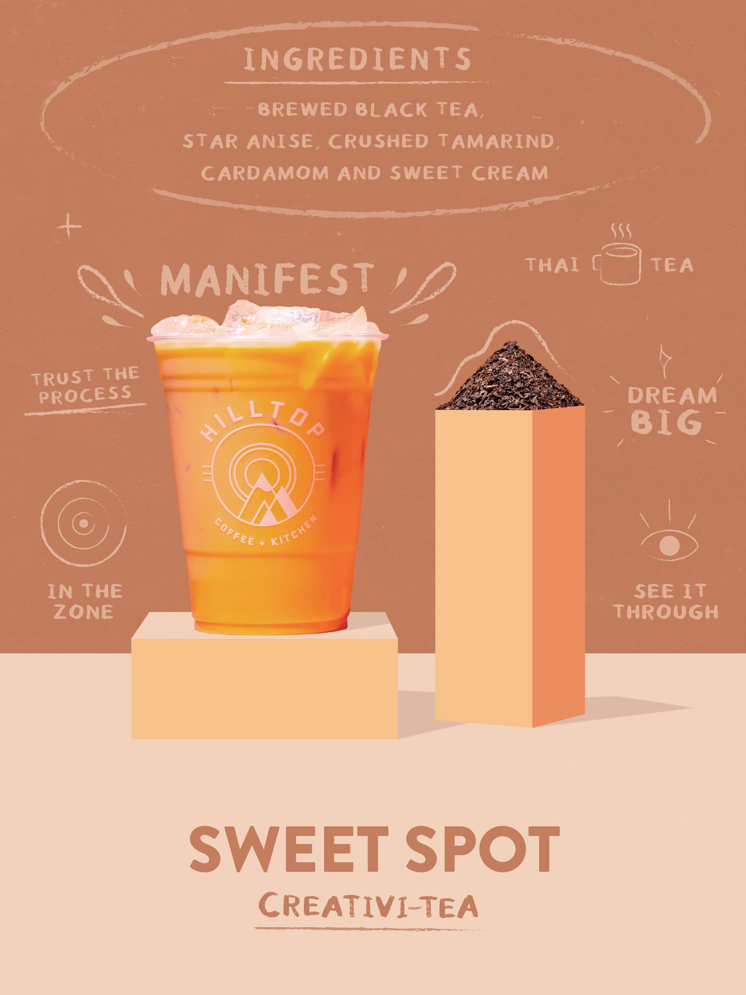 Hilltop Coffee + Kitchen launched three 2022 summer drinks from July 5th through September 30th, designed to inspire creativity and encourage customers to get their creative juices flowing. I led the creative direction for the campaign, bringing the vision to life through design assets that aligned with Hilltop’s existing brand identity. I collaborated closely with our photographer to art direct the shoot and ensure each drink was captured with intention. In post-production, I retouched final selects, built immersive 3D environments for each drink, and managed quality control with our print distributors. I delivered both digital and print-ready assets for a multi-location rollout, with promotional materials displayed across all three Hilltop shops.