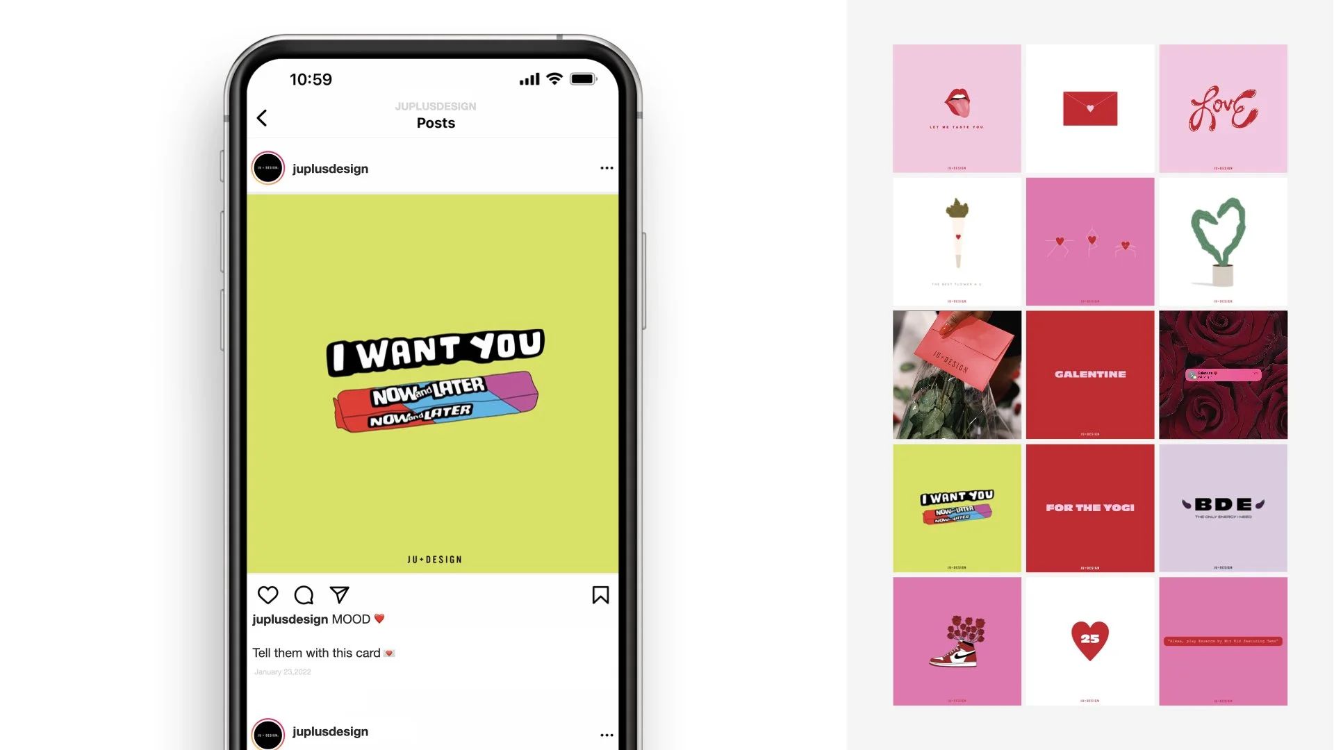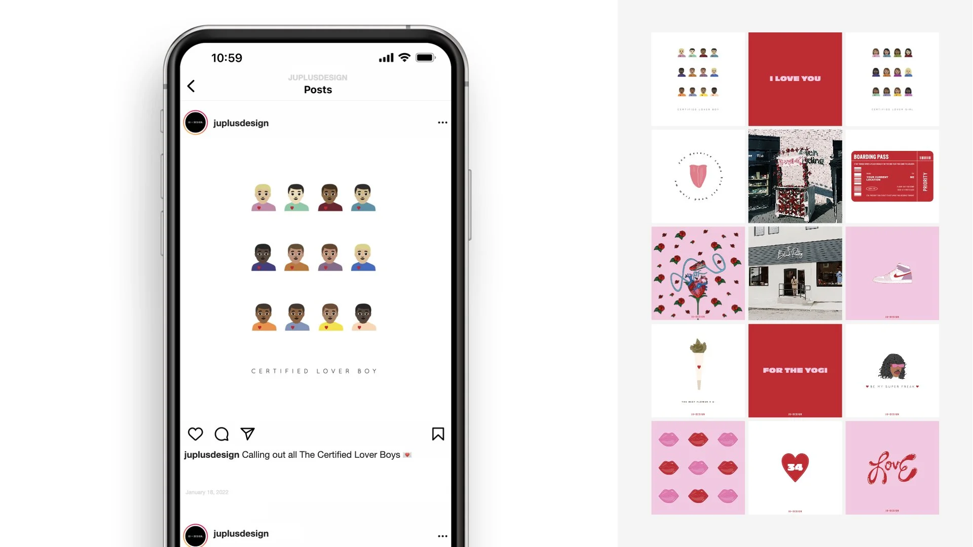 For this year's Valentine's Day content rollout, I used Hootsuite, which is a content scheduler that allows story and feed automated posting on Instagram. I first organized all my final files in Adobe Illustrator with a grid to get a consistent feel and aesthetically pleasing Valentine's Day themed feed. I began posting on January 10th and ended on February 14th.